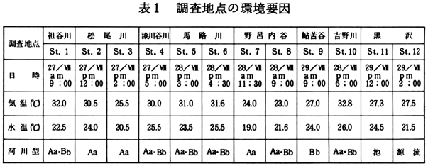 3.調査結果と考察 調査地点における環境要因として、気温、水温を測定した結果を表1に示した。