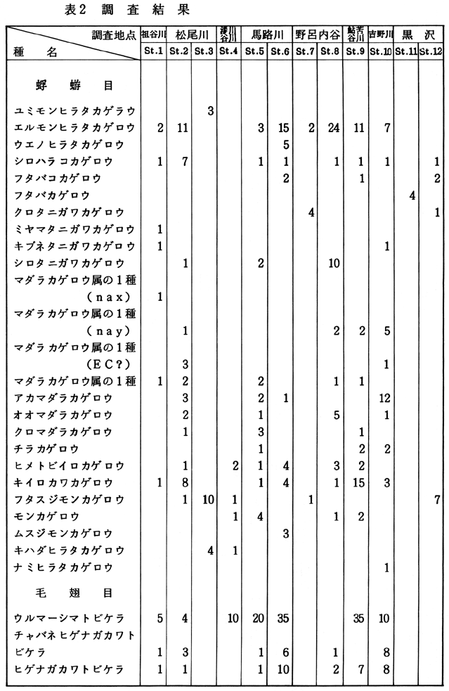 採集された水生昆虫は表2に示すように、全体で8目83種が確認された。