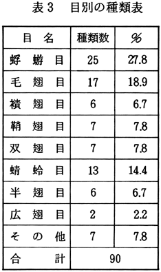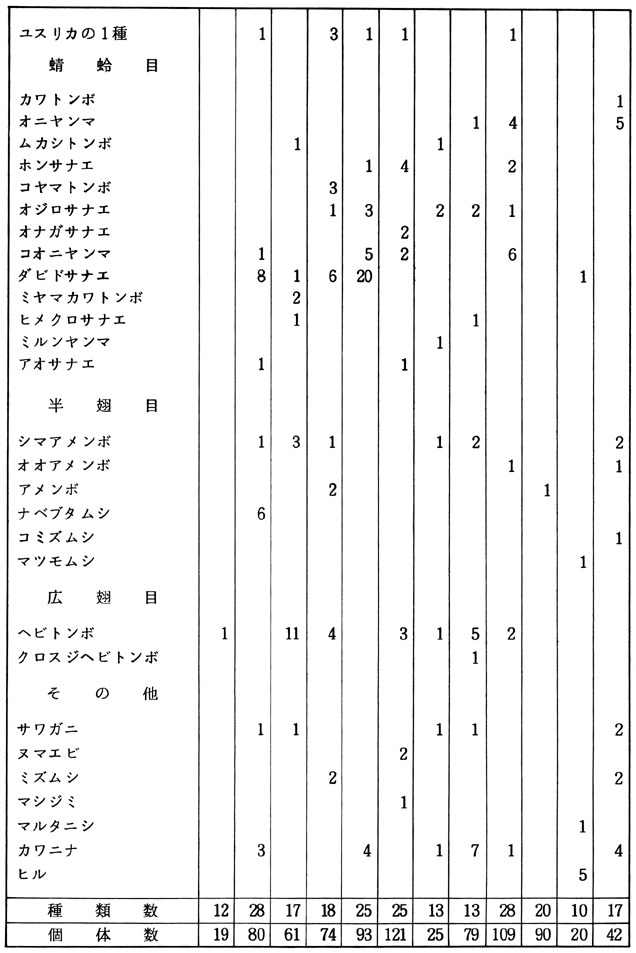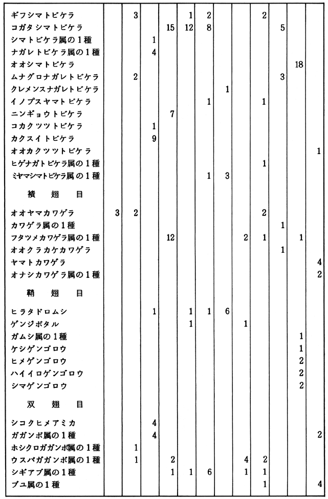 4.おわりに 今回の調査で特に感じたのは、個体数が少ないことである。1個体のみ採集された種類がずい分と多い。夏季は昆虫が羽化するためもともと個体数は少ないといわれるが、付近一帯をくまなく、入念に調べた結果にしては、少ないと思われる。目に見えない水質の変化、河床の荒廃が、このような水生昆虫類に影響を及ぼしているのであろう。なお、今回は8目83種の水生昆虫を確認したが、町内を流れる水系のほんの一部の調査であり、なおこの上に多くの種類が生息すると予想される。調査した範囲内の水系は、まだ水生昆虫類の生息できる環境であるが、今後荒廃が進み、昆虫類の姿が消えることがないよう願いたい。