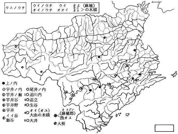 (2)尾井ノ内、追立、大由ノ木頭……。 1.西祖谷山村尾井ノ内(おいのうち)は、前記(1)の宇井ノ内と同類である。ウエ→ウイ→オイの音変化で説明できる。 2.西祖谷山村誌の説明では、尾井ノ内は、「二つの尾根に囲まれた地形による」としている。しかし、地形の状況をさらに検討してみよう。 3.尾井ノ内は、祖谷川支流戸ノ谷(とのたに)にある。下の部落が戸ノ谷。中の部落はナコウチ。上の部落が尾井ノ内となっている。 4.つまり、前記(1)の木頭村宇井ノ内←→中内と同様に、西祖谷山村尾井ノ内←→ナコウチと対応した地名表現である。 5.したがって、尾井ノ内は「上ノ内」の変化地名とみるのが妥当である。谷の上部にあって、入りこんだ小平地の意である。 なお、上ノ内(うえのうち)は、上那賀町平谷上ノ内、同町海川上ノ内がある。平谷には下ノ内(しものうち)という対応した地名があり、海川はウエンチまたはウエンジョに対してシモンジョのように表現している。 6.木沢村坂州追立(おいたて)について、村誌は、「何人カヲ追立テタル……」との説明を引用しているが、上那賀町音谷追立はどうであろうか。 7.追立の原義は、前記尾井ノ内の場合と同じく、「上立(うえたて)」の変化地名とみるのが現地に適っている。つまり、「断崖、または断崖上の部落」である。 8.木沢村追立は、坂州木頭川の峡谷にのぞむ断崖地帯である。昭和16年に県道沢谷線が開通するまでは、旧沢谷村への交通は、車力を通さぬ難所であった。 9.「オイ」を「上」の意味で考えるとき、木頭村出原を大由ノ木頭(おゆ(又はおい)きとう)と古称したことも理解できよう。当地は、木沢村木頭(きとう)、木頭名(きとうみょう)とともに、往時は那賀山荘内にあった。これら三つの木頭を区別するために、大由ノ木頭(おゆ(又はおい)きとう)と呼び分けたのであろう。つまり、「上流奥地にある木頭」の意である。 10.さらに、木頭村西宇追川内(おいごち)は、その近辺にある同類地名、西宇ゴロゴーチ、折宇細川内(ほそごーち)よりも、山の上部にある、古い川内地形である。「オイ」=「上」の意味に適合している。 11.最後に麻植(おえ)郡西麻植(にしおえ)などについては、忌部氏に関連した「麻殖」説もあるが、前記オイ、オユと同じく、ウエ(上)の意ではなかろうか。往時の中心地「名方」よりウエの地方、つまり上流を意味する地名と見たい。「美馬」が「三好」を含めて別の文化圏だったとする説と考え合せて興味ぶかい。