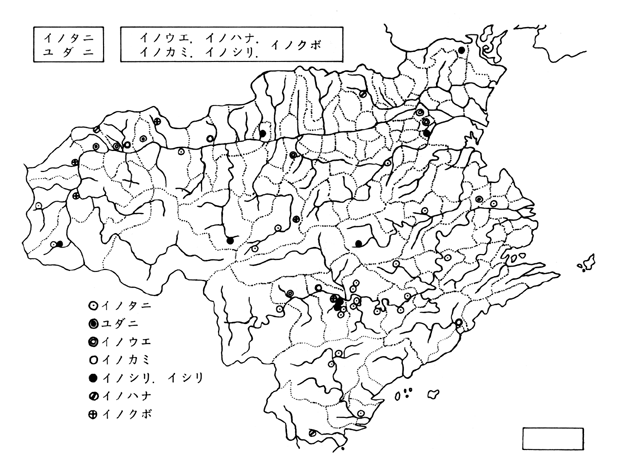 (8)井ノ上、井ノ神、井ノ本、井ノ頭、井地岡……。 1.いずれも、自然湧水、井泉に関係する地名群で、先学の結論が定まっている。 2.井ノ上はイノウエ、イノカミいずれにも発音するが、本義は大体同じとみてよい。強いて言えば、イノウエは井ノ辺と関連があり、井泉の近辺をさす場合が多く、イノカミは用水の上手、上流部をさす場合が多い。 3.井ノ本、夷ノ本、猪ノ本の類は県内に多数散在している。これらは、いずれも井泉の湧く所ないし取水口と関連している。飲用、潅漑などに用いられ、その重要性の故に水神を杞る場合が多い。したがって井ノ神の地名も出来るのである。 4.井ノ頭、猪ノ頭は、ともに井ノ本と同じ地名である。地名としてはあまり多くはないが、山地の家で、家号となる場合もある。 5.井地は「井泉」の意である。井地岡、井地ノ本は井ノ頭と同じ地名とみてよい。勝浦川、那賀川流域を主として、県南地方に特徴的な地名である。