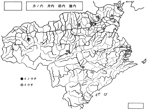 用水がある。の二つを満足する所であるが、用水との関係がより深いと言えよう。 8.この結論をたしかめるために、阿南市学原町居内にあたってみた。当地は、国鉄阿南駅と見能林(みのばやし)駅の間にあり、国道55号線の東側である。農業用水は、富岡町西ノ口から桑野川の水を通している。飲料水は予期したとおり、清澄な伏流水があるとの事だった。 9.上水道完備の現在も学原町居内の人は井戸水も使用している。ところが、国道西側の前田は伏流水がなく、飲料水の不便なところだと話してくれた。たゞ残念なことは、数年前、近所にボーリングセンターができて、井戸水の具合が悪くなったとこぼしていたのが印象的である。 10.また、学原(がくばら)町居内も比較的高い地区である。大正7年、頷家町(りょうけちょう)の土手が切れて、桑野川が氾らんした。富岡町周辺が浸水したが、ここの居内は安全だったとの話である。 11.鳴門市大麻町市場居内は、旧吉野川べりのデルタの居内である。当地も良質の井戸水があり、飲料水に恵まれている。しかも、デルタ地帯では比較的土地が高く、付近の人は、これを「市場の高田池」と呼んだと言う。往時、かんがい用水は、もっぱら足ぶみ水車にたよった。隣接の喜来(きらい)が浸水しやすかったのと対照的である。 12.板野町那東(なとう)居内は、四国三番札所の奥ノ院藍染院(あいぜんいん)の付近である。当地の井戸は、松谷などの伏流水があり、那東で、もっとも強く良質だと言われている。 13.松谷(まつだに)とキビガ谷に貯水池があり、その農業用水が居内で二幹線に分岐する、のど首でもある。 14.海部町芝居内は、旧川西村の主集落野江に隣接している。裏手に、新井(あらい)神社の岡と、お薬師さんの小山がある。 15.飲料用の井戸は水深5m、良質で夏涸れは、まったくない。芝の居内は、芝用水の根源である。水源は部落から100mの上流で、海部川四岸梅ノ木谷から取水している。用水路の巾×1.5m、高さ×2m、延長40mの暗渠は岩盤をくっさくした大工事である。居内の西谷に開口し、下流の高園(たかぞの)まで配水していた。しかし、現在は、海部川共同用水に編入されている。 16.当地の特徴も、土地が高く、いかなる水害もうけないこと、用水の取水元であることなど、他の居内と共通している。 17.こうみると、井川町井ノ内も、おのずと理解できる。井川町は、旧辻町と旧井ノ内谷村の合併によるものである。町名の井川は、往時、この付近が井川庄と呼はれたことに由来している。井川の意味は、後記する井ノ谷と同じく、はやくから農業用水に利用されたことによるのであろう。 18.旧井ノ内谷村は、井ノ内谷川の流域で、井ノ内とも井内とも呼んでいる。旧町村界は、下流の辻町側が金竜山(きんりゅうざん)、井関(いせき)で、井ノ内谷村側は、落倉(おちくら)、流堂(ながれどう)、吹(ふき)などである。地名が示すように、峡谷断崖の地形である。井ノ内谷村は、全体が袋状の盆地で、「〜内」型の地名にふさわしい地形である。 19.井ノ内の原義も、池田町川崎居内の場合と同様に考えられる。すなわち、イ
