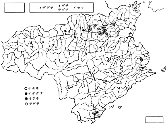 (9)井口、出口、井関、井尻 1.井ノ口、井口の地名もかなり多い。とくに吉野川北岸支流の用水取水口の地名となっている。阿讃山地から流下する天井谷は、山麓近くで伏流水となる。井口は、伏流水となる前の地点で用水路に確保する所である。井口は井出口ともよばれ、また出口と呼んでいる。 2.さらに、阿波郡・板野郡では、逆に伏流水が露頭する所があり、これもまた、出口と呼んで用水としている。 3.井関は、水量豊富な吉野川南岸から県南に多い地名である。 4.井ノ尻は用水路の最末端部の地名である。県内に6地点あるが、いずれも用水不足がおこりやすい。 5.脇町大字猪尻(いのしり)はその代表地点と言えよう。当地は古来県西部の中心地であった。藩政時代には家老の稲田屋敷もあったが、飲用水、潅漑水ともに不便であった。猪尻の人々は、通称「鎌倉の泉」から水を汲むのが早朝の仕事であった。また、この泉から遠い地区では、10m以上の深井戸を持つ旧家にもらい水をしたのである。 6.猪尻地区の農業用水は、さらに不便な配水経路をとっている。いわゆる井口は大谷の奥にあり、天神池、ガク池、成田池に用水路をつなぎながら数キロにおよぶ配水路を作った。その末端が猪尻である。 7.程度の差はあれ、他の井ノ尻でも用水利用には苦しんでいる。一宇村実平(さねひら)猪ノ尻、鳴門市櫛木(くしぎ)井ノ尻などで、用水関係のトラブルが現在も語りつがれているのは、その辺の事情を物語るものであろう。 8.用水に関する地名は、このほか、井ノ浦、井ノ下、井ノク(奥)のほか多様である。「井〜」型の地名と関係した苗字(姓)を持つ家が、近辺に多数あるのは言うまでもない。