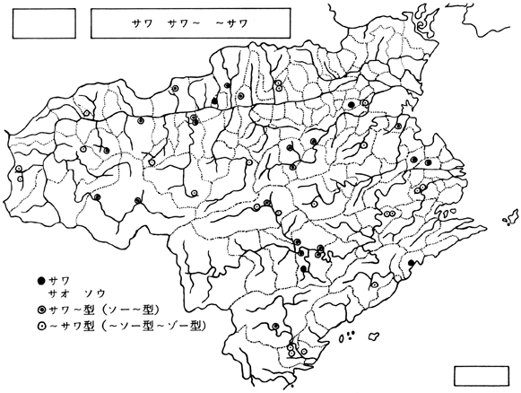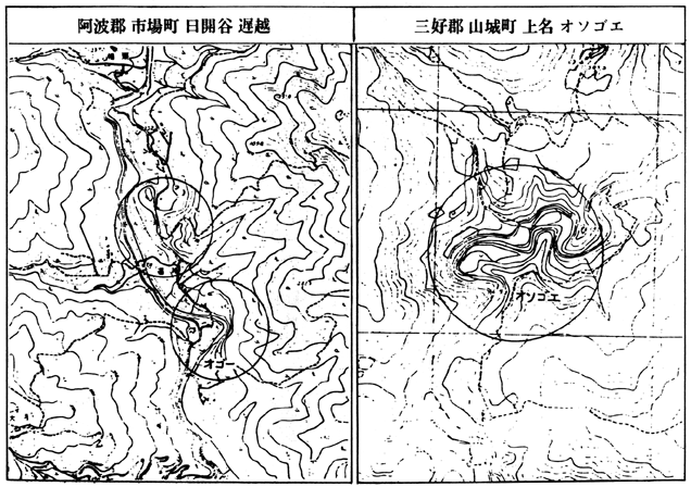 (10)黒沢、左右山、左右内、惣後……。 1.五のつく地名は多数ある。沢はサワ・サオ・ソーなどと発音する。一宇村広沢(ひろぞう)、半田町八千代大惣(おおそう)、上勝町旭菅蔵(すげぞう)、上那賀町音谷惣谷(おんだにそうだに)などのようにきりがない。 2.池田町漆川黒沢(くろそう)は有名な湿原台地である。他に、木沢村小畠黒沢(くろそう)、鷲敷町中山黒沢(くろそう)がある。地名辞典によれば、黒沢は「クラ沢」つまり「岩沢」と説明されている。 3.羽ノ浦町宮倉沢田は、山あいの湿田である。徳島市勝占町惣田(そうだ)、美馬町藤宇惣田(そうだ)、東祖谷山村落合宗田(そうだ)など、いずれも沢田と同じく湿田の地名である。 4.神山町下分左右内(そうち)、貞光町太田僧地(そうち)は、ともに「沢内」の意である。小谷を入った小平地があり、いわゆる沢の多い地形状況をしめしている。 5.同じく神山町下分左右山(そうやま)、貞光町太田僧山(そうやま)は、「沢山」の意である。沢の多い蔭地の山、左右山では土地柄を生かした養鱒場が有名である。 6.美馬町惣後(そうご)は、町内の郡里山と重清山に介在する地区である。阿讃山地の南面傾斜地に多数の小溝が流下する地形で、原義は「沢越」であろう。池田町松尾尾後が「尾越」であるのと同じである。 7.上那賀町日真そうえ、神山町阿川曽江は「沢辺」ないし「沢上」の意であろう。脇町曽江名曽江山は「添山」と解する説があるが、何れに添うた地形であろうか。 8.県内各地にある西沢、南沢、長沢、柳沢などは字義どおり理解できるが、日和佐町山河内白沢は「シロザワ」ならともかく、「ハクサワ」ではよくわからない。 9.木沢村沢谷与沢(よざわ)は「岩沢」の意であろう。上那賀町桜谷(さくらだに)、井川町井内桜(さくら)などのサクラについては先学の諸説があるが、なおよく学習したい。 (11)オソゴエ、遅越、細越、オソ谷。 1.池田町大利オソゴエは、祖谷川に突出した大申の尾根の基部を越える道で一ある。大申は「尾廻し」の意である。尾根を廻ると1kmほどあるが、オソゴエの道は300m以下である。しかも往時は、尾根まわりの道がなかっただけに、やはりオソゴエは、重要な道だったにちがいない。 2.オソゴエの地名は県内に16地点をかぞえる。若干の地点で地名説話があるので、それを含めて考えてみたい。 3.神山町神領北オソゴエは、鮎喰川上支左右内谷口の曲流部にある。二またに開いて突出した尾根の基部を越える道がオソゴエである。四国八十八ケ所の12番札所焼山寺の旧参道になっている。年配の人の説明は、「かわうそがこの道を越したので呼び伝えている」とのことだった。 4.市場町日開谷遅越(おそごえ)は、旧讃岐街道にある。現在はまったくの平担路で、どこを越すのかよく分らなかった。しかし、日開谷につき出た先太りの尾根の基部を通る道が遅越であろうと判断した。 5.当地の年配の方の話によれば、遅越の由来はつぎのようである。 讃岐の腕ききの大工が発願し、切幡寺に一夜建立に出かけた。仕事を終えて帰る途中、弟子たちに遅れた。当地を越すことが出来ずに夜が明けて果てた。大工をまつった地蔵が現存しているという。 6.相生町蔭谷おそごえは、那賀川中支蔭谷の曲流部である。突出した尾根は三段にひらかれた田地である。所有者川田氏によれば、四代まえの吉蔵がひらいた。下に岩があって浅田であるが日照と水利がよくて良田である。この尾根の基部の小道は通称赤線一郡道で、隣部落の横石に通じている。 7.その由来について年配の方の説明はつぎのようであった。明治になって土地が払い下げになった時、横石部落との境界設定がもめた。隣村のことでもあり、つき合いや縁組みもあるので、結局話し合いとなった。両者夜明けとともに牛を追って山行し、相会した所を村界にしようというのである。 8.横石がわの山が険しいので、蔭谷のシ(人)はゆっくりかまえていた。ところが横石のシ(人)は未明から行動した。夜明けにはすでに山を越え、蔭谷部落のまぢかに来て「遅いぞ!」とトエタ(叫んだ)のである。ここがおそごえで、つまり部落の境界となっている。 9.上那賀町深森ヲソゴエは、那賀川上支古屋谷川の曲流部で、古屋野々尻との境界になっている。 10.曲流の突出部は円形の小山で、細い頭部を旧道が通っている。地形はきわめて特徴的で、ヲソゴエの代表地形を見る感があった。土地の人は、小山をハナマルと呼んでいる。全山にハナシバ(樒)が密生していたからだと説明してくれた。 11.しかし、ハナマルの由来は、ハナシバによるのでなく、むしろ、その地形によったと思われる。那賀川上流地方では、円形の突出部を、すべてハナマルと呼ぶからである。原義は「端丸(はなまる)」であろう。 12.なお、ここには二戸在住している。土地の人は、古屋側のをトンネルと呼び、深森側をオソゴエと呼んでいる。当地ヲソゴエの頚部に30mの用水トンネルがある。四代まえの先代が開通したという。 13.深森にある