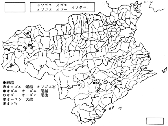 谷の水は多くはないが夏涸れもしない。 27.オソ谷の解釈も、オソゴエの場合と同じく、「細谷」の音変化と考えられる。 (12)尾後、大後、尾越、大越。 1.尾後、ヲゴーは、県内に若干見られる地名である。池田町大利上尾後(かみおごう)、同町松尾下尾後(しもおごう)がある。尾後は、県道三縄停車場菅生線―祖谷街道が出合に開通するまでは、旧三縄村内の重要交通路にあった。出合より奥の松尾川流域の人々は、尾後を経由して漆川に出た。大きい笠松のある、高い尾根道である。 2.上尾後の「カザスキ大師」は、この尾根を越える人々の安全を守る、ありがたい「オダイッサン」であった。山を下りて出て行く人は、雄大な吉野川と里分を眼下に見下して決意したであろう。また、山に帰る人は、この赤松の尾根に辿りついて安堵したにちがいない。つまり、尾後は、「尾越え」の意である。 3.ヲゴーは、山城町大野、同小川谷のほか、市場町日開谷なとにある。いずれも「尾越え」の地形にかなっている。しかし、土地の人々は、尾後、ヲゴーの原義が分からなくなっている。 4.市場町の場合、ヲゴーとともにオーゴンとも併称して、黄金説話が聞かれた。昔、盗賊の首領が、この尾根に黄金を埋めて去ったという。戦後、好事家が試堀したが失敗に終った。数年まえに国道改修が行なわれたときにも、土地の人が期待と関心を寄せた。しかし黄金は出なかった。 5.山城町上名ヲウゴエ、井川町井内尾越は、その原義を示す地名である。いずれも尾根越しの道があり、土地の人は当然に、その意味を理解していた。 6.なお、井川町井内大後は、オゴー、オーシロを併称している。また、上那賀町大後はオーウスロと呼ぶ。多少ニュアンスがあるので、いずれ現地に当って検討してみたい。 7.日和佐町山河内大越(おおごし)は「尾越し」の意である。当地は、上那賀町谷山、日和佐町赤松などに通ずる旧道がある。この場合は、分水嶺を越す峠の意味も含んでいる。 8.尾越え型の地名は、県内にかなりあると思われるので、さらにくわしく調査していきたい。
