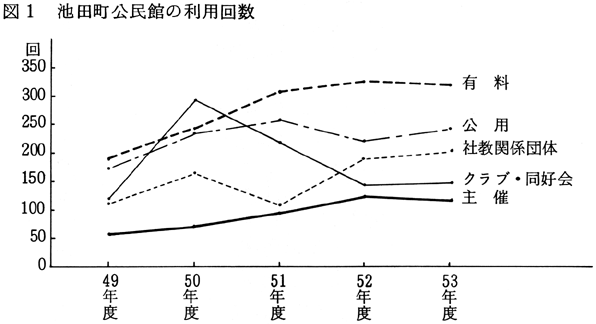 2 池田町公民館の利用状況 池田町公民館は、昭和49年7月に開館し、その後池田町の重要な施設の一つとして位置づけられてきた。この公民館は、池田町の全地域を対象とするものであって、いわゆる「中央公民館」に当たる。改めていうまでもないが、公民館は「市町村その他一定区域内の住民のために、実際生活に即する教育、学術及び文化に関する各種の事業を行い、もって住民の教養の向上、健康の増進、情操の純化を図り、生活文化の振興、社会福祉の増進に寄与すること」(社会教育法第20条)を目的としている。そしてこの目的達成のための公民館事業としては、(1)学級、講座、展示会、集会等を開設・開催すること、(2)資料等を備え、その利用を図ること、(3)各種の団体、機関等の連絡を図ること、(4)住民の集会その他の公共的利用に供すること、などがある。したがって、公民館がその機能を果たし得ているかどうかを検討するためには、上記の目的にかなうような事業が計画・実施され、かつ公民館の施設がその目的にかなうような利用に供されているかどうかについて分析してみることが必要である。ここでは、池田町公民館の利用状況の分析を通して、この公民館が池田町においてどんな意義をもっているか考えてみたい。 ここで使用するデータは、池田町公民館の「利用状況報告」(毎月)をもとに、各年度の利用回数と利用者数(延べ)を利用種類別に集計したものである(表1参照)。まず、「主催」、「共催」、「クラブ・同好会」、「社会教育関係団体」、「公用」、「有料」という利用種類別について簡単に説明しておきたい。「主催」とは、池田町公民館の主催事業(学級・講座など)のうち、公民館施設を利用したものをいう。「共催」とは、公民館と他の団体・機関との共催による事業のうち、公民館施設を利用したものである。「社会教育関係団体」のなかには、婦人会、青年団、体育協会、スポーツ少年団、PTA、青年会議所などが含まれている。「クラブ・同好会」は、趣味を同じくする人たちのグループであるが、詩吟、木彫、生花、俳句、墨絵、尺八、謡曲などがある。「公用」による利用の主なものとしては、予防接種、検診、同和研修会、保育所、給食センター、町役場の諸集会などがある。また「有料」による利用は、次のいずれの場合にも該当せず、上記の分類に含まれないものをいう。(1)町内の社会教育関係団体が公民館事業と同じような事業を行なう場合、(2)町の行政と密接な事業を行なう団体や機関が事業または会合を行なう場合、(3)官公署その他特別の団体が事業または会合を行なう場合、(4)町教育委員会または公民館が特に必要と認め共同主催または後援する場合、(5)前各号に掲げる場合のほか、教育委員会が特に適切な事業と認めた場合。 表1をみて、まず何よりも印象づけられることは、利用回数も利用者数もきわめて多いということである。たとえば昭和53年度の場合、利用回数の総計は1,028回となっているが、開館日を1月平均25日として計算しても、1日平均3.4回利用されたことになる。 利用回数の年次別変化を利用種類別にみたのが、図1である。これによると、利用回数の増加が著しいのは「有料」による利用であり、また「公用」による利用も漸増の傾向にある。これに対して「クラブ・同好会」は、昭和50年度に非常に高い利用度を示しながらも、その後は激減している。「社会教育関係団体」の利用は、「有料」や「公用」のように多くはないが、年次別にみると漸増の傾向がうかがえる。「主催」も着実に回数を増やしていることがわかる。