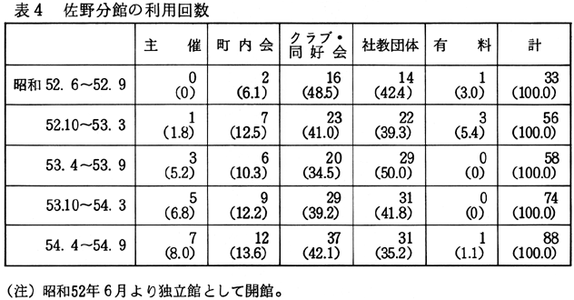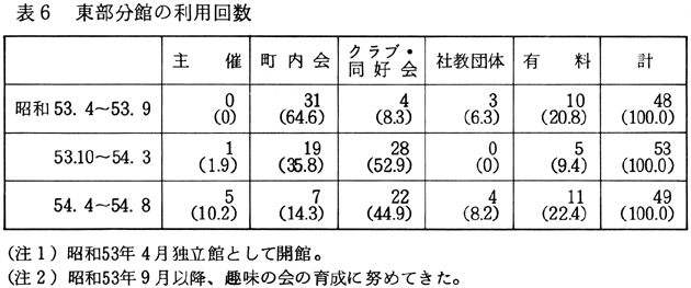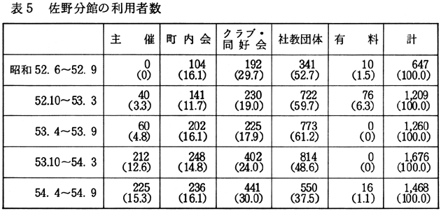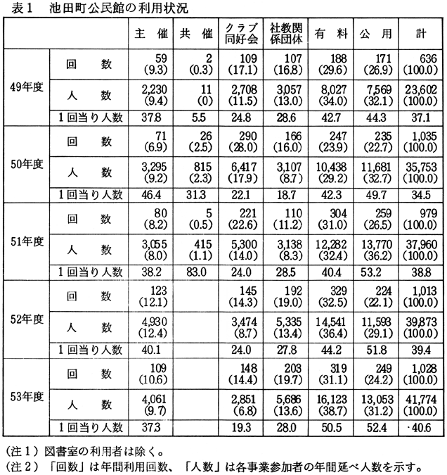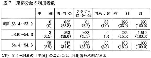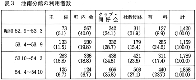利用回数にみられる以上のような特徴は、利用者数についても同様に指摘することができる(表1参照)。 「有料」による利用が増加した理由としては、次のようなことが考えられる。すなわち、(1)使用料が比較的安く、しかも設備(駐車場、マイクロフォンなど)がそろっているため、手軽に公民館を利用する団体が増えてきていること、(2)社員研修などに利用する企業が増加していること、(3)池田町が四国の中心に位置するという地理的条件から四国四県の会合に利用される事例が増えてきたこと(15)、などである。しかし、何といっても、池田町内に気軽に利用できる施設が他にないということが一番大きな理由のようにも思われる。「有料」利用のなかには、必ずしも公民館を利用しなくてもよいのではないかと思われるものもあるようだが、現状ではやむをえないことであろう。 「公用」の事業や会合は、池田町公民館が新設される以前は町役場会議室、池田会館、民間の会議室などを利用していたが、開館後は公民館が利用されるようになった。また「公用」の会合自体が増加しているため、利用回数も漸増している。 「社会教育関係団体」の場合は、当初は婦人会、青年団による利用が主であったが、昭和50年度後半から体育協会、スポーツ少年団などによる利用が増加したため、それ以降の利用者数の増加が著しい。 「クラブ・同好会」は、従来個人の家などを利用して会合を開いていたが、池田町公民館が新設されると、そこを利用するグループが増えた。その後、分館が独立館として新設されると、この分館の方が使用料も安く休館日もないため、分館施設を利用することが多くなった。池田町公民館の利用回数および利用者数が減少しているのは、そのためである(昭和50年度以降、池田町公民館から1〜2kmのところに2つの独立の分館が建設された)。また昭和51年度より、クラブ・同好会の性格によって、「有料」の方に分類されるものが出てきたことと、池田町公民館の使用料が値上げされたことが影響しているように思われる。なお、参考のため、池南、佐野、東部の各分館の利用回数および利用者数を示しておこう(表2.3.4.5.6.7)。