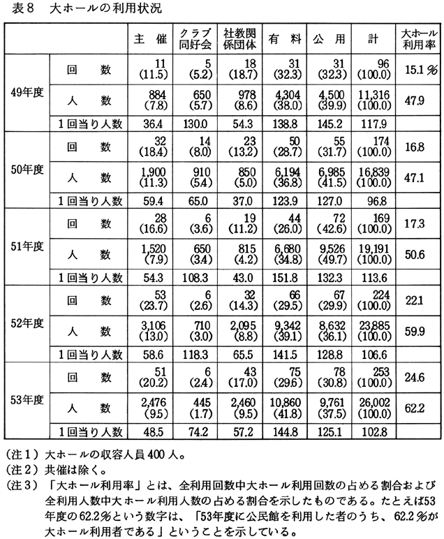 ところで、池田町公民館には大ホール(400人収容)がある。会議室、和室など他の部屋の収容人員は50人以下であり、多人数を収容することができるのは大ホールだけである。表8は、大ホールの利用状況を年度別に示したものであるが、1回当り100人を超える会合は、「有料」や「公用」による利用の場合に多くなっている。