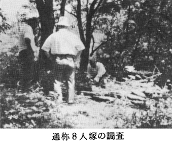 この石臼で特に注目されることは、凝灰岩造という、石臼の石材としては、常識をはずれたものが用いられていることである。何を作るときに使用されたものか、地域産業とどう結びつくか、今後の研究を期侍したい。 なお、この地区には、雲辺寺登山口の丁石・へんろ石など、価値高い石造文化財が所在している。 (3)白地地区 (a)石積塚 6基 所在地 池田町白地仙野 伝報恩寺跡付近 地元の人たちが、8人塚とよび戦国争乱期の戦死者の墓でないかといっているもの。