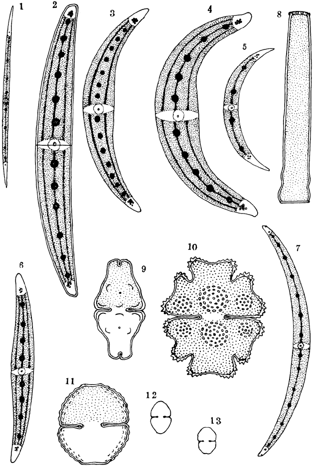 Ehrenb. 11.Cosmarium obtusatum Schmidle. 12.C. granatum