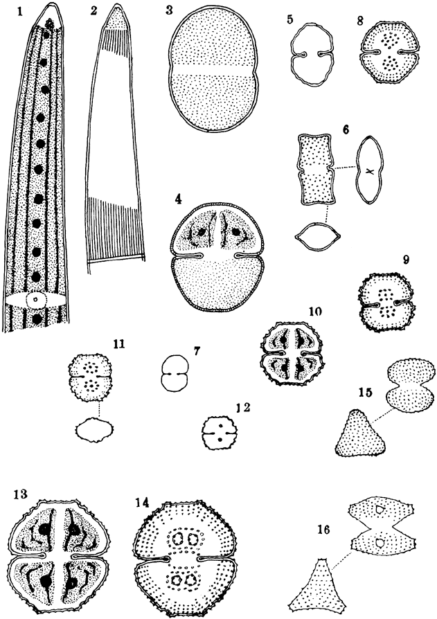 Gutw. 15.Staurastrum punctulatum Br■b. 16.St. hexacerum (Ehrenb.)