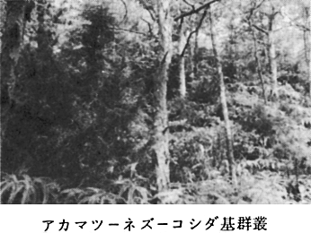 〔1〕−I−1 ヤマハギ亜群 群落識別種 ヤマハギ、ススキ ヤマハギ・ススキは森林発達の初期にでてくる陽生植物である。アカマツの樹高も低く、亜高木層の発達も十分ではない。 〔1〕−I−1−A ナツハゼ変群 群落識別種 ナツハゼ 平均出現種数 18.2種 ナツハゼも日当たりのよい所に分布する。アカマツは高木層になく、樹高6〜8mの亜高木層に出現する。草本層が100%近く、コシダでおおわれていて、他の植物が侵入する隙間もない程である。傾斜はゆるやかで5〜30゜である。 〔1〕−I−1−B クチナシ変群 群落識別種 クチナシ 平均出現種数 19.7種 常緑低木クチナシで識別できる群落であり、ナツハゼ変群より、出現種数の多い群落である。 〔1〕−I−1−C 典型変群 平均出現種数 33.5種 アカマツの樹高もクチナシ変群より高く、草本層のコシダも次第に少なくなり、ソヨゴ、ヒイラギ、ミツバアケビ等が増加し、アカマツ林として、より発達したものと思われる。 〔1〕−I−2 ウラジロ亜群 群落識別種 ウラジロ 平均出現種数 25.1種 讃岐山脈200〜540m付近に分布し、草本層では、ウラジロが増加し、コシダが減少している。傾斜は30〜45゜と比較的急な所である。