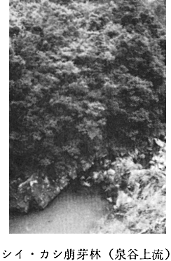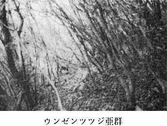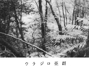 〔3〕−I−1−A ヤマツツジ変群 群落識別種 ヤマツツジ、ヤマハギ、イタビカズラ 平均出現種数 25.5種 北西斜面の傾斜角度が平均50゜の所である。 高木層・亜高木層がなく、低木層と草本層とで構成されている。伐採後まだあまり生長していない初期のものでないかと思う。 〔3〕−I−1−B ウラジロノキ変群 群落識別種 ウラジロノキ、ナンカイアオイ 平均出現種数 19.7種 樹高6〜8mあり、亜高木層は100%近い植被率で草本層の受光量は少なく、ナンカイアオイなどのように光補償点の低い植物のみが生育できる林である。 〔3〕−I−2 典型亜群 平均出現種数 18.5種 ウンゼンツツジなどが出現しない林で、草本層も、植被率が少ない。ヤブムラサキなどがごくわずか低木層・草本層に出現し、あとはほとんどウバメガシがおおっている林である。 〔3〕−II 典型群 平均出現種数 13.6種 ヤブムラサキ群の識別種のない林でウバメガシが100%近くおおっている所と20%位の所とがある。草本層は比較的植被率が高いのが特徴である。 〔4〕シイ・カシ萌芽林 泉谷川ぞいに帯状にごく僅か分布している(付図−1参照)。かつて原植生としてのシイ林があったと思われるが、今はシイは数本残っているにすぎない。シイの樹高も8〜10mで傾斜角度70゜、方位N80Wである。