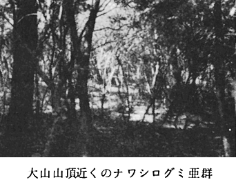 〔1〕−II カマツカ群 群落識別種 カマツカ・コウヤボウキ 海抜500〜670mの讃岐山脈上部に分布する群落である。コシダ群に比べ、アカマツ群落としては、より遷移の進んだものと思われる。 大山頂上付近は寺の所有林であったため、下部のものに比べ、人為的影響をうけることが少なかったことによると考えられる。それは図−2の胸高直径と海抜のグラフで、カマツカ群が右上に位置していることからわかる。 〔1〕−II−3 ナワシログミ亜群 群落識別種 ナワシログミ、ナガバモミジイチゴ、ケクロモジ、サンショウ、ウリハダカエデ 大山山頂から尾根ぞいの海抜580〜670m付近のアカマツ林でケクロモジ、ウリハダカエデのような中間温帯林に多い種が出現する。アカマツの樹高は10〜16mもあり、林内の上部は80〜90%もおおわれており、そのため、草本層の受光量は非常に少なく、植被率も5〜10%ときわめて少ない。