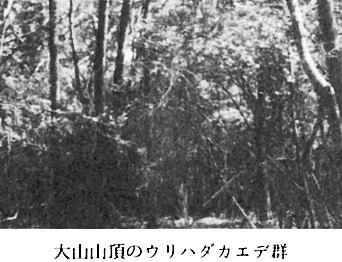 〔1〕−II−3−A イヌガヤ変群 群落識別種 イヌガヤ、シハイスミレ、ヤマジオウ、イボタノキ 平均出現種数 30.2種 海抜610〜670mに出現しているアカマツ林である。 〔1〕−II−3−B 典型変群 平均出現種数 27.0種 海抜580〜610mに出現し、出現種も少ない。 〔1〕−II−4 典型亜群 平均出現種数 31.3種 カマツカ、コウヤボウキのみが群落識別種として出現する林である。 〔2〕 コナラ群落 コナラ群落には今までに、コナラ−クリ群集(横川1959)、ミズナラ−クリ群集(堀川・佐々木1959)などが知られているが、まだ十分には整理されていないのが現状である。 本町の場合、アカマツ林が尾根を中心に分布し、コナラ林は谷脇や山頂を中心に分布している。 今回は海抜450〜480m付近の中腹と640〜691mの山頂付近のものを合わせて13か所調査した。テーブル操作の結果、次のような群落を識別することができた。(付表−3参照) 〔2〕−I ウリハダカエデ群 群落識別種 ウリハダカエデ、イワガラミ、コツクバネウツギ、モミ また大山山頂付近に出現する群落である。コナラ等の樹高も8〜10mと低く、林内も比較的明るい。