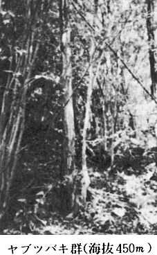 〔2〕−I−1 テイカカズラ亜群 群落識別種 テイカカズラ、コバンノキ 平均出現種数 33.8種 海抜691mの山頂に出現している群落である。 〔2〕−I−2 典型亜群 平均出現種数 27.7種 山頂から少し下がった640〜670m付近の群落で、テイカカズラが出現しない群落である。 〔2〕−II ヤブツバキ群 群落識別種 ヤブツバキ、ヤブニッケイ、シキミ、シロダモ、マルバウツギ 平均出現種数 36.4種 海抜450〜480mに出現する群落で、出現種数も、ウリハダカエデ群に比べて多く、コナラ等の樹高も少し高い。