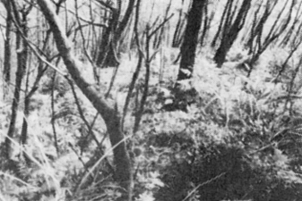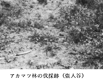 主な構成種は次のとおりである。 コジイ(3.3)、アラカシ(4.4)、ノグルミ(1.1)ヤマザクラ(1.1)、コナラ(1.1)、ヤブツバキ(1.1)ネズミモチ(1.1)、マルバアオダモ(1.1)、ヤマウルシ(+)、ミツバアケビ(+)、ツルマサキ(+)、アセビ(+)、ススキ(+)、コバノガマズミ(+) 〔5〕 伐採跡群落 群落識別種 アカメガシワ、ベニバナボロギク、コウゾ、サネカズラ、クスギ、ダンドボロギク、オオアレチノギク 平均出現種数 31.0種 盗人谷川上流左岸の海抜130mに、アカマツ林の伐採跡があった。(付表−5参照)伐採によって、針葉樹(アカマツ、スギ……)はわき芽を出さないが、一般に、広葉樹はわき芽を出す。伐採跡では陽生植物のベニバナボロギク、ダンドボロギク、アカマツなどが風による種子散布により発芽し、伐採によるわき芽の生長との競争がはじまる。 伐採跡にはベニバナボロギク、ダンドボロギクなど、キク科の帰化植物が出現するのが特徴である。