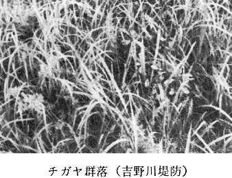 草本層の被度が60〜80%である。主なものはコナラ(わき芽)モチツツジ(わき芽)、アカマツ ススキ、ワラビなどである。 〔7〕チガヤ群落 群落識別種 チガヤ、メドハギ、イヌドクサ、スギナ、キツネノマゴ、スイバsp、オトコヨモギ、ウツボグサ、カタバミ、カワラマツバ、オニタビラコ、ミヤコグサ、コナスビ、スミレ、ホソバヨツバムグラ 平均出現種数18.2種 瀬部の吉野川堤防で調査したものである。毎年何回か機械により草刈がなされている。川辺のメドハギ、イヌドクサ、カワラマツバ等が侵入している。(付表−7参照)