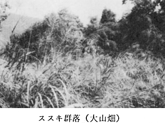 〔8〕ススキ群落 群落識別種 ススキ・ドクダミ、ニガイチゴ、スイカズラ、ゲンノショウコ 平均出現種数 10.6種 海抜383mの大山畑の放置した畑跡にできた群落である。主な構成種はヘクソカズラ、ノブドウ、ノイバラなどである。(付表−8参照)