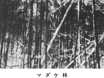 〔10〕竹林 讃岐山脈沿いに点々と分布している。今回はマダケ林、モウソウチク林、各1か所の調査をしたので、そのデータを示す。 〔10〕−I マダケ林 調査 昭和55年9月15日、場所 大山寺下、海抜440m、方位 S60E、傾斜 30゜、調査面積 15×15平方メートル ・高木層 樹高8〜12m、植被率95%、胸径7cm マダケ(5.5)、モミ(1.1)、カゴノキ ・亜高木層 樹高6〜7m、植被率5%