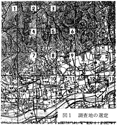 2.調査地区と調査方法 1)調査地区の選定:上板町は、北から大山(691m)を頂点とする低山帯、それに続く山麓、市街地、農耕地(乾田、畑作地帯)、大河川(吉野川)といった環境が展開している。これら様々に異なる環境における鳥相把握のため、図1のように町全体を14のメッシュに分け、そのうち第3、第4、第8、第11、第13、第14のメッシュを調査地区としてサンプリングした。
