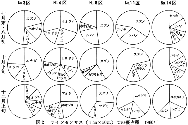 ・ No.8区:人家密集地から山麓の雑木林にかけてのコースである。夏秋冬3季を通じて、スズメ、ツバメ、ムクドリ等人家に密着した生活をする鳥が優占している。しかし、平地の市街地から山麓の雑木林へと、コース内で環境の変化がみられるため、出現種数は山間部のNo.3、No.4の区よりもかえって多くなっている。 ・ No.11区:水田地帯のコース。3季ともスズメ、ツバメ、コサギ、ヒバリ、タシギ、ハシボソガラス等の水田地帯を代表する種が優占している。 ハシボソガラス、ムクドリは秋冬季に群行動をすることが多いが、秋、冬の調査でこの2種が優占種としてあがっているのは、いずれもコ−ス内に群れが出現したためである。 タシギは湿地や湿田で普通に越冬するが、上板町の水田は殆んどが乾田で、このコースも乾田畑作地帯にある。にもかかわらず、秋冬にタシギの個体数が多いのは、コース内に用水路がありここに多く生息するためで、水田全体に多く生息しているものではない。 ・ No.14区:吉野川北岸堤沿いのコース。夏季には平地の草地に多いセッカが優占している。秋季のコシアカツバメは南下途中の群れと思われる。冬季のユリカモメは吉野川を溯って来たものである。 2)第十における定点カウント結果(No.13区、図4、図5)ここでは石井町も一部含めた第十のセキ一帯を調査区としている。