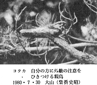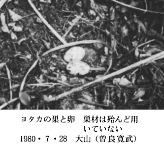 サシバを主としたタカ類の秋の渡りのコースは、大きく二つに分けて見ることができる。ひとつは蒲生田岬を中心とした県南部に入り剣山系を西へ進むコースである。もうひとつは、淡路島から鳴門海峡を経て阿讃山脈を西に進むコ−スである。鳴門経由のものは、鳴門から南へ下り、眉山、中津峰などを経て剣山系のコースヘ入るものもあるが、大部分がそのまま西へ進み、上板町を通過して阿讃山脈沿いのコ−スをとるようである。 4)特記すべき種について ・ ヨタカ ヨタカは、夏鳥として県内の山麓から標高1400m付近にかけて渡来し繁殖している。県内の繁殖記録は、1980年7月一宇村でヒナが発見された例があるが、今回の調査で7月28日、初めて巣と2卵が発見された。この巣卵は大山の標高550mの道路脇にあったもので親鳥が抱卵中であった。巣は巣材を殆んど用いず地面に直接産んであったが、卵は親鳥の体色と同じく保護色で、土や枯葉などにうまくとけ込んでいた。親鳥は人が近づくと巣から飛び立ち数メートル離れたところへ降りてうずくまり、親鳥の方へ近づこうとするとまた少し飛んでは地上に降りる「疑傷行動」をさかんに行うのが観察された。その後、巣から2卵ともなくなったが、ふ化してヒナが移動したものか、外敵に持ち去られたものか不明である。