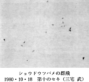 ・ ショウドウツバメ ショウドウツバメは北海道で繁殖し、本州以南では春秋に通過する旅鳥であるが、県内での過去の記録は極めて少なかった。しかし1980年10月には鳴門市、小松島市、鴨島町などで数十から200±の群れが観察され、上板町でも高志の水田地帯、第十のセキ付近で観察された。中でも第十のセキではコシアカツバメ30±とショウドウツバメ60±〜80±の混群が10月17日から10月28日まで見られた。過去極めてまれに、しかも数羽しか記録されなかったショウドウツバメが1980年の秋になぜこれだけの数が現れたのか、原因はわからない。