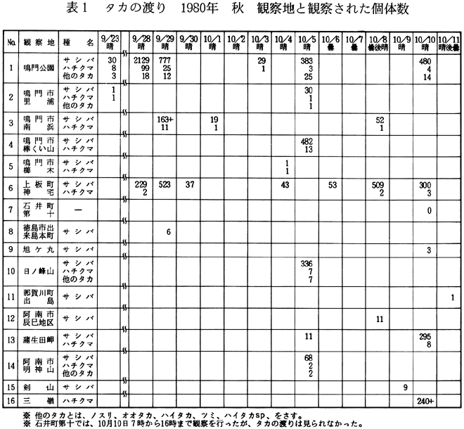 対照のために吉野川河口の変化も併記してあるが、11月15日の狩猟解禁と同時に第十のセキではカモ類は激減するのに、吉野川河口では個体数の減少は見られず、かえって増加する傾向にある。これは、第十のセキ一帯は猟区(いわゆる乱場)であり、吉野川河口は鳥獣保護区であるためである。上板町と石井町にまたがる第十のセキ一帯に保護区を設置すれば、県内有数のカモ類の越冬地になるはずである。 3)タカ類の秋の渡りについて タカ類の秋の渡りのコースを解明するために、9月下旬から10月中旬にかけて県内十数カ所で調査を行い、上板町でも神宅に調査地点を置いた。(図7、表1)