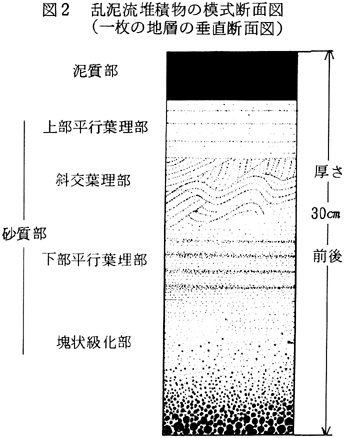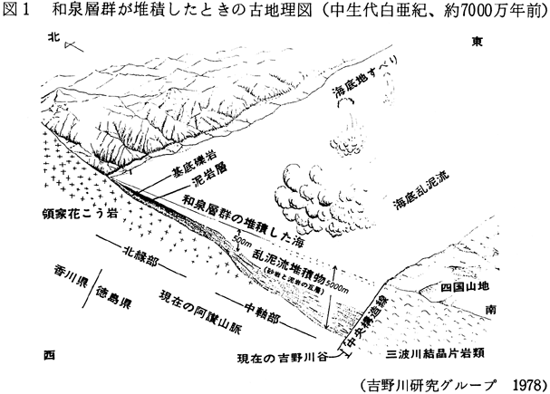 和泉層群は阿讃山地を形成する主要な地層である。中央構造線の北側に沿って東西に細長く分布しており,南北の幅は12km前後である。北縁部は香川県にあたり,領家花こう岩類を不整合に覆っている。 和泉層群を構成する地層は砂岩・泥岩の互層が、主体であり,礫岩や酸性凝灰岩層を伴う。とくに図1に示したように,北縁部には基底礫岩相が東西に細長く分布し,その南側に泥岩相が東西に分布している。中軸部では砂岩相ないし砂質泥岩相が卓越している。なお,砂岩相とは砂岩の比率が60%以上の砂岩泥岩互層であり,砂質泥岩相とは砂岩の比率が40〜60%,泥岩相とは砂岩の比率が40%以下の互層である。 北縁の基底礫岩相と泥岩相は陸棚のような浅い海に堆積した地層であるが,中軸部から南方にかけての砂岩相や砂質泥岩相は乱泥流によつて形成された堆積物である。すなわち,図1のように北縁部の浅海に堆積した泥や砂が,海底地すべりなどによって海水と混り合い,密度の高い流れ(乱泥流)となって,海底の斜面を流れ下ってできた地層である。このような乱泥流堆積物では,砂と泥がリズミカルな互層をなすことが多く,砂岩層中には級化構造(図2)が発達する。また、地すべりによる層内褶曲も見られる。