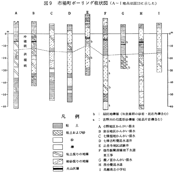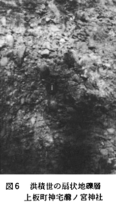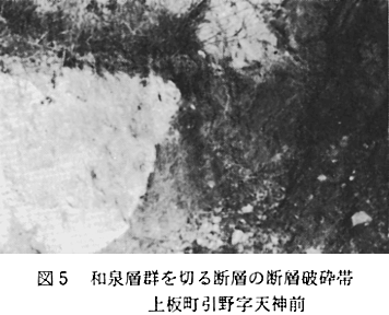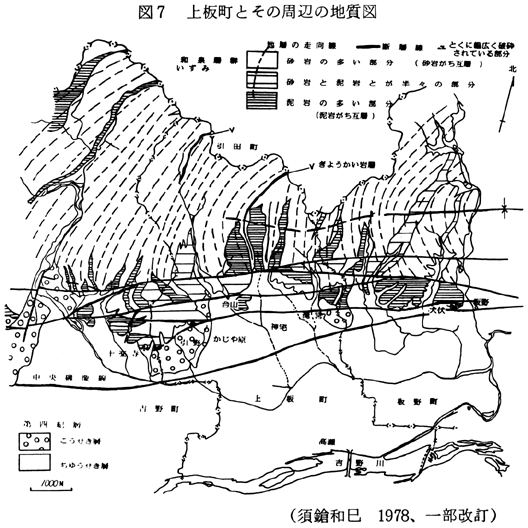 (当地域の主な断層破砕帯露頭について) 中央構造線:結晶片岩北縁の露頭は、市場町切幡と土成町秋月の町境付近、板野町犬伏、鳴門市大麻町桧にあり、その中間に位置する上板町では扇状地の地下を走ることになる。犬伏(旧鍛冶屋原線犬伏駅北東方)の土取場では結晶片岩破砕帯の北側の和泉層群泥岩相が南北幅200m以上にわたって破砕されている。 和泉層群中の東西性断層:熊ノ庄神社裏にては丘陵南端より北へ向かって約100mの間、和泉層群砂岩がち互層が破砕されている。 天神前北方、丘陵南端より丘陵内の砂防ダム工事現場までの間、南北幅300mにわたって和泉層群破砕帯となっている。砂防ダムのすぐ下流にて、砂岩と破砕された泥岩との境界面は走向N40〜45゜E、傾斜40〜75゜Nである。 御所カントリークラブ内の東側稜の切り取りでは数地点に大小の断層破砕帯がみられるが、とくに、丘稜をNEE−SWW方向に横切る谷の延長線上で、泥岩がち互層を切る幅3mの破砕帯がありその走向・傾斜はN70゜E、80゜Nである。さらにそのNE方向延長の、台山公園北側の凹地の地下にあたる北泉谷川河岸において、砂岩がち互層を切る幅1mの破砕帯が数本みられる。N20〜30゜E、90〜70゜E。 県果樹試験場北側、大谷−黒谷間にNEE−SWW方向の谷があり、その延長上東側稜線に幅1mの破砕帯がある。走向・傾斜はN80゜E、50゜N、北側の砂岩と南側の泥岩とを境している。 南北性断層:土成町、御所カントリークラブ西門(裏口)にて、和泉層群泥岩層のなかに幅3m程の破砕帯があり、斜交する2系統の断層面が測られる。ひとつはN80゜E、60゜N、幅1m;ひとつはN40゜E、65゜N、幅10cm。 洪積世の扇状地礫層は、切れ切れの台地となって残っている(十楽寺の裏山:高度80〜50mの間;瀧ノ宮の県果樹試験場・八坂神社のある丘)ほか、沖積世扇状地面の地下に伏在している(図9、地点E、F、Gの記号b)。一方、洪積世の吉野川氾らん原堆積物(結晶片岩礫をふくんでいる)は上板中学校のやや南(図11地点F)、瀧ノ宮(同地点G)まで分布している(図9)。 沖積世扇状地層のなかには、約7.000年前の降下火山灰層が挟まれている(図9、A、B、E、F、G、H)。