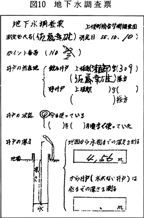 2 地下水 扇状地面から吉野川の氾濫原面にかけての浅井戸の地下水位(地層のなかにとじこめられた地下水でないので自由地下水という)がどのようになっているかを明らかにする。さらに近年地下水位が低下して枯井戸が多くなっているのでその状況を記緑しておくため、地下水位の調査を行った。 2−1 調査時期 浅井戸による地下水は農業灌漑に用いられているため、地下水位は季節的に変化している。夏から秋にかけて水位は上昇し、秋から冬・春にかけて低下する。秋から冬にかけては水位は安定しており、50cm位しか変動しない。したがって、今回は10月10日〜12月10日の間に調査を行った(1980年)。 2−2 調査方法 短期間に多くの資料を集めたいこと、阿波学会・町の調査に多くの参加を得たいことから、上板中学校の生徒に協力を依頼し、図10の調査表に記入してもらうことにして、70地点の資料が得られた。ここに誌面をお借りして感謝の意を表します。さらに、大戸井・山口が現地を巡り、合計423地点の資料を集めた。東部地区は若干資料が不足している。