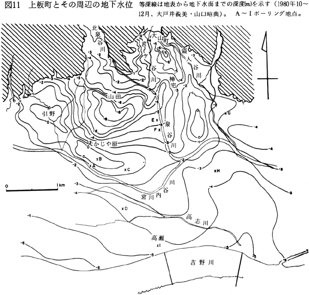 〔扇状地面下の地下水位〕北泉谷川の扇状地(鍛冶屋原扇状地)および宮ケ谷川・盗人谷川の扇状地(神宅(かんやけ)扇状地)ではいずれも扇央部(それぞれ山田付近、大山町付近)で最も低く、扇頂部(それぞれの谷の出口)・扇端部(それぞれ東原−鍛冶屋原−小柿、原西)では高い。すなわち、扇状地の中央部では土石の堆積層が厚く堆積して、中央部がふくれたような地形になっているためである。 〔吉野川氾濫原面下の地下水位〕吉野町〜板野町にかけて宮川内谷川は吉野川の旧河道であると考えられるが、この筋に沿って地下水位は地表下0〜−2mである。ところがさらに南側の吉野川本流筋にむかって−5〜−6mと低下ししている。地表面はほぼ水平であるから、地下水面が南に向かって下っていることになる。吉野川沿いの地下水面は吉野川の水面に等しいと考えられるから、この地区の地下水面低下・井戸枯れは吉野川河床高度の低下(砂利採取による?)のためと考えられる。