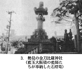 3.金比羅信仰 金比羅は、航海の安全を守る神である。江戸から明治にかけて、阿波藍の移出はめざましいものがあった。その藍の殆どが船で搬出されていたので、海上運送の無事と、藍商の繁栄を祈願するため金比羅詣りが盛んに行なわれた。このことは、徳島市勢見の金比羅さんをはじめ、香川県琴平の金比羅さんなどに藍関係者が奉納した巨大な石灯篭や狛犬、玉垣などによってもよくわかる。これらによって当時の藍商の威勢が如何に強大であったかを知ることができる。