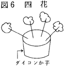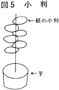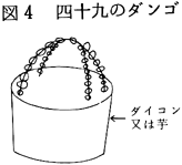 (6)泣き女 大正始め頃まで、泣くのが上手な人が雇われて死人の前で泣くことがあった。 (7)トナリと葬式の手伝い トナリ 隣組、郷、支部等の組識で、仲間うちをトナリと呼ぶ。今は葬式、婚礼、共同作業を助け合うが、昔は田植も助け合った。葬式にはトナリから男女2名が手伝いに出る。その他に連帯感の強い株内も強力に手伝う。 トナリの手伝い 責任者を決め、その指揮でそれぞれ役割を分担して行なう。喪家は責任者へ費用を預けて依頼する。仕事は大体以下のとおり。 神棚の覆い 忌中札の準備 ヒキャク(昔) 寺への連絡 診断書の準備 役所関係の連絡 火葬場の段取り 棺の準備 式具の準備と買物 段飾りの準備、製作 ソーレンの手配(昔) レン台の製作(昔) 入棺用具の準備と買物 支度用の買物と膳類調達 お供えの準備と買物 死装束の準備(座ブトン、単衣、経帷子、サンヤブクロ等) 支度(精神料理……図3) 四十九のダンゴ(図4) 野辺送り用の準備と製作(チョーチン、六地蔵、杖、小判(図5)四花(図6) 帰りの竹馬の準備(図7 ムマ) 塩祓いの準備 尚、近頃は葬儀屋で間に合うことが多くなった。