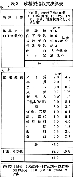 この表でもあきらかなように甘蔗作付総反数は百十町を越え、砂糖生産高は約40万斤に至っている。 なかでも、板野・阿波両郡は、全生産高の九割以上をしめて一大生産地を形成した。 当時の経営史料として、甘蔗作及び砂糖製造の収支決算書が「土成町史」上巻に、紹介されており、それをもとに次の表を作成した。(表2・3)