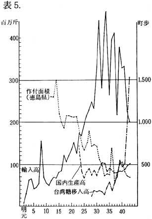 (解説)三十五年ノ収穫ハ三十年ニ対シテ四割九分ヲ減ジ又累年減少ノ傾アリ。然ルニ該作地ハ砂交質ニシテ気候温暖温度高ク其ノ変化著シカラサルノミナラズ凍害ノ憂ナキヲ以テ素ヨリ栽培ニ適スト雖近来肥価高クシテ蔗価高カラス 旦ツ洋糖輸入ノ為メ其影響ヲ被ムリ尚農業主要節ノ夏期ニ当リ却ッテ他ノ作物ノ利ニ如カサルヲ以テ漸次転作スル者アルノ結果作付反別モ亦著シク減シタリ