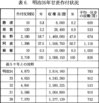 4.阿波糖業の選択=三盆糖 次の史料は、現在徳島県立図書館に残されている「明治36年勧業年報」の甘蔗作の部であり、これによると当時の甘蔗作からみた糖業の状況がよくわかる。(表6及び解説)