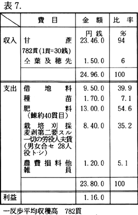 いすべく苦心しているのであって将来の展望として次の文章をかかげ勧業の奨励に力をそそいでいる。 (将来)甘蔗ハ本県特有ノ作物ニ係リ製糖ト共ニ県ノ生産ヲ補クルヤ大ナリ。唯タ近時不振ノ故ヲ以テ今遽カニ之レカ栽培ヲ廃止スヘキモノニアラス。由来外糖ハ品質我国人ノ嗜好ニ添ハサルモ価格ノ低兼ト菓子原料に多大ノ費消スル結果ハ其輸入ヲ引キツツアル状勢ナレハ国糖ノ需要ハ将来尚ホ倍々望アルヲ以テ能ク栽培方法ノ研究ヲ要ス。抑モ甘蔗栽培ノ主眼タル概シテ単ニ収穫ノ多量ノミヲ望ムヘカラス。含有糖分ノ多キヲ主トシ之ト共ニ増収ヲ図ルニ在リ而シテ此目的ヲ達センニハ肥料性分ノ如何ニ依リ糖分ノ多少ニ関係アルモノナレハ在来肥料ニ適量ノ燐酸性分ヲ配伍スル等学理ヲ応用シ改良ニ努ムルヲ至要トス。 なお、参考資料として、当時の反当り収穫高と利益についての同年報所収の史料をあげておくが、この段階ではもはや甘蔗作が、利あるものではなくなっていることも指摘されている。(表7)