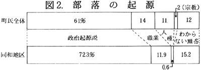 ここには、差別問題に対する目の向け方の違いがあらわれている。同和地区では、居住地(どこに住んでいるか)ということに端的にあらわれる部落差別に目を向ける人が53.5%と過半数を占めるのに対して、一般町民の場合は、職業、学歴、家柄、貧富などといった、いわゆる「一般差別」的なものを重視する人が多くなっている。 (2)部落の起源 部落の起源についてどの説が正しいかをたずねた質問項目をみると、図2のとおりである。