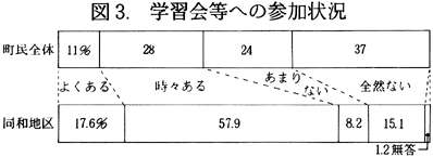 2つの調査であらかじめ設けた選択肢が同一でないという難点があるが、しかし、大体の傾向を知るうえで支障はないと思われる。こうした事業を「不公平だ」(24%)または「逆差別だ」(46%)とみる意見が、一般町民の場合非常に強くみられ、両者をあわせると70%に達する。一般町民のいわゆる「ねたみ差別」がきわめて根強いことがうかがわれるのである。 これに対して、同和地区では、「地区外の必要な人にもおこなうべきである」という意見が35%とかなりの割合を占めているものの、それ以上に注目されるのは、「同和地区の環境改善をすることは、ひいては地区外もよくなることである」という意見が32%、つまり3分の1を占めていることである。このように、一般町民と同和地区住民の間には大きな意見の違いがみられるのであるのであるが、しかし、町全体のなかでは少数者(マイノリティ)としての位置づけしか与えられていない同和地区の人々のこうした意見は傾聴に値するものではなかろうか。 (4)学習会等への参加状況 学習会、講演会、研修会などへの参加状況をみると、図3のとおりである。
