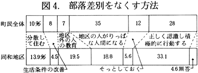 「全然参加したことがない」と答えた人が、同和地区では15.1%に対して、町民全体では37%と非常に多くなっている。一般町民が学習会などに参加しようとしない傾向はきわめて強く、このこと自体、「さわらぬ神にたたりなし」という町民の同和問題に対する態度のあらわれといわねばならない。 (5)部落差別をなくす方法 部落差別をなくす方法についてたずねた質問項目をみると、図4のようになる。