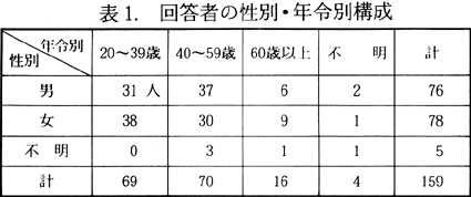 1 調査の概要 (1)調査対象 上板町同和地区住民(満20歳以上) (2)調査時期 昭和55年8月2日〜8月8日 (3)調査方法 調査票を8月2日に配布し、各自が記入したものを8月8日に回収した。 (4)回収率 配布数282に対して、有効回収数159であった。有効回収率は56.4%である。 (5)回答者の性別・年令別構成 表1のように、性別では男76人(47.8%)、女78人(49.1%)、不明5人(3.1%)となり、年令別では20〜39歳69人(43.4%)、40〜59歳70人(44.0%)、60歳16人(10.1%)、不明4人(2.5%)となっている。