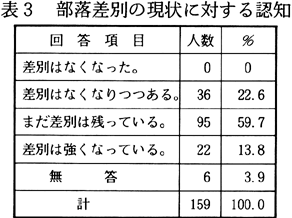 2.同和問題に対する意見 次に、同和地区の人々の同和問題に対する意見を主要な質問項目に限定して見ておきたい。 まず、全体的な傾向としては、次のようなことが指摘できる。 (1)部落差別の現状に対する認知 部落差別の現状について、同和地区の人々はどのように見ているのだろうか。表3によれば、「まだ差別は残っている」(59.7%)と「差別は強くなっている」(13.8%)をあわせると、73.5%とほぼ4分の3を占めている。「差別はなくなった」と答えた人はひとりもいない。差別がどこにあるかを具体的にたずねると、「恋愛・結婚」をあげた人が46人、「就職・職場」が16人、「住所」が5人、あとは無答となっている。このように、結婚差別を指摘する人が多い。