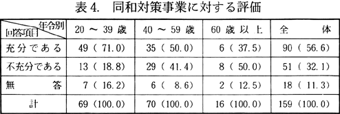 「充分である」と答えた人が56.6%と半数を超えているが、しかし、「不充分である」と答えた人も32.1%と決して少なくない。不充分なところとして、具体的には、「車がはいらない道路」、「排水施設ができていない」、「ゴミ処理の問題」などがあげられている。 なお、年令別にみると、20〜39歳では「充分である」が71.0%と多数を占めているのに対して、40〜49歳、60歳以上では「不充分である」がかなり多くなっており、年令による評価の差があらわれている。 (3)環境改善事業に対する意見 全体的な傾向については、すでに表2で見たとおりである。年令別にみると、20〜39歳で「同和地区の環境改善をすることは、ひいては地区外もよくなることである」が23.2%とやや少ない傾向がみられる(表5参照)。
