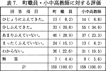 「解決にむかって進んでいる」と「解決の役に立っていない」がほぼ同じ割合を占めているが、「どちらともいえない」が半数に近い。質問の意味が十分理解されなかったこともあると思われるが、環境改善事業を中心にした同和対策事業という形のものだけでは同和問題の解決につながらないという気持もあらわれているのではなかろうか。それは、結婚問題などを考えてみれば、うなづけるように思われる。 (5)町職員・小中高教師に対する評価 同和問題に本気でとりくむ上板町職員や小中高教員がふえたかどうかをたずねると、表7のようにな