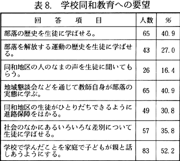 町民全体では「同和地区の人が差別を受けないようりっぱな人間になる」というのが35%と非常に多くなっていることに注目したい。この考え方は、部落差別の原因と結果を取り違えて「差別されるのは部落の人自身に悪いところがあるからだ」とみなし、「その責任は部落の人自身にあるのだから、彼らがりっぱな人間になるよう努めるべきだ」とするものである。 これに対して、同和地区では、「みんなが同和問題について正しく理解・認識して、積極的に差別をなくすよう行動する」が33.1%と1番多くなっている。しかし、「地区の人がりっぱな人間になる」が18.8%と少なくない。これは、上述のような一般町民の考え方を受け入れた融和主義であると考えられる。また「同和地区の人を啓蒙して、差別しないよう教育をする」が、同和地区の方が相対的に多く、逆に町民全体では7%にすぎない。このように、一般町民は,自分自身が同和教育を受けねばならない存在であるとはあまり意識していないのである。 なお、「同和地区の人が一定の地域にかたまって住まず、分散して住むようにする」と「みんなが同和問題のことを口に出さず、そっとしておく」は、町民全体では、それぞれ10%と12%であり、いわゆる「分散」論や「寝た子を起こすな」論の誤りを徹底させることが必要である。また「分散」論が同和地区で13.9%もある点については、居住地ということに端的にあらわれる部落差別の厳しさの反映としてとらえるべきであり、その底にある同和地区の人々の本質的な願いに目を向けなければならないであろう。 以上、きわめて限られた質問項目にもとづいて、同和地区の人々と一般町民との間の意識の違いをみてきたが、実は、ここから、一般町民にとっての学習課題がいくつか浮き彫りにされてくるという事実に着目する必要がある。すなわち、部落差別といわゆる一般差別との関連、人種起源説の誤り、逆差別論の誤り、部落差別の原因と結果を取り違えた考え方の誤りなどについて、学習を深めていかねばならないのは、一般町民の方であるにもかかわらず、学習会などへの参加者は少ない、という厳しい状況がみられるのである。