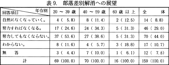 学校同和教育と家庭同和教育との一致協力への切なる願いがこめられているのではなかろうか。次に多いのは、「部落の歴史を生徒に学ばせる」と「地域懇談会などを通じて教師自身が部落の実態に学ぶ」の2つであり、いずれも40.9%となっている。 (7)部落差別解消への展望 「部落差別はなくなると思うか」とたずねたところ、表9のような結果を得た。