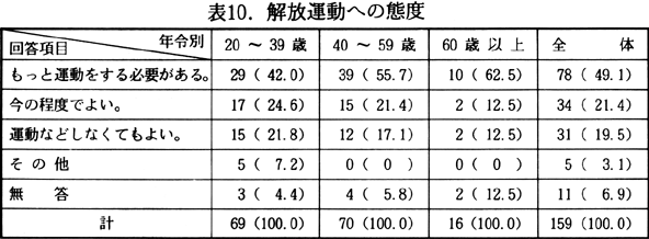 「運動などしなくてもよい」といった考え方をする人は19.5%となっており、比較的少ない。このように、解放の見通しについてきわめて悲観的であるにもかかわらず、というよりもむしろ、こうした見通ししかもてないだけになおさら、多くの人々が運動を一層強化する必要を感じているのである。 なお、年令別にみると、とくに大きな差があるわけではないが、20〜39歳で「もっと運動をする必要がある」と答えた人が42.0%とやや少ない傾向がうかがわれる。 以上、8つの質問項目に限定して調査結果を見てきた。 この調査の結果については、性別・年令別の集計を行なっているが、性別による差はほとんどみられなかった。しかし、すでにみたように、年令別による差は、人数が少ないのではっきりした傾向はとらえにくいものの、微妙にあらわれているように思われる。そこで、くりかえしになるが、年令別にみた調査結果についてまとめておきたい。 今述べたように、人数が少ないため、年令をこまかく分けて考察することができない。それで、一応、20〜39歳、40〜59歳、60歳以上という、やや大ざっぱな分け方をしてみた。20〜39歳は戦後育ちの世代、40〜59歳は戦前の世代、あるいは少なくとも戦前の時代を多少なりとも経験した世代ということになる。こうしたきわめて大まかな分け方でとらえた場合、とくに注目されるのは、20〜39歳という戦後世代の人々の意識が特徴的だということである。たとえば、「同和対策事業に対する評価」(表4)をみると、「充分である」と答えた人が20〜39歳では71.0%と非常に高率であり、40〜59歳で「不充分である」が41.4%を占めているのと対照的である。「環境改善事業に対する意見」(表5)で、「同和地区だけでなく、地区外の必要な人にもおこなうべきである」と「同和地区の環境改善をすることは、ひいては地区外もよくなることである」という2つの意見のどちらを支持する人が多いかをみると、20〜39歳は39.1%と23.2%、40〜49歳は31.4%と41.4%となっており、それぞれの割合が逆になっている。とくに「地区外もよくなる」という考え方が20〜39歳に少なくなっているのである。 また「部落差別解消への展望」(表9)をみると、「努力してもなくならない」と答えた人が40〜59歳の38.6%に対して20〜39歳は53.6%と半数を超えている。このように、20〜39歳に悲観的な見方をする人がとくに多くなっているのである。このことと関連して、「解放運動への態度」(表10)をみると、「もっと運動する必要がある」と答えた人が、40〜59歳では55.7%と半数を超えているのに対して、20〜39歳では42.0%と半数に満たないのである。 以上のように、人数が少ないので確定的なことはいえないとしても、同和地区の20〜39歳という若い層の人々のこうした意識の特徴は、現在の同和行政や同和教育に対して深い反省を迫るものといわねばならない。それと同時に、解放運動の側からも、若い層の人々の意識の点検が必要となっているように思われる。