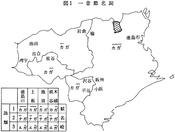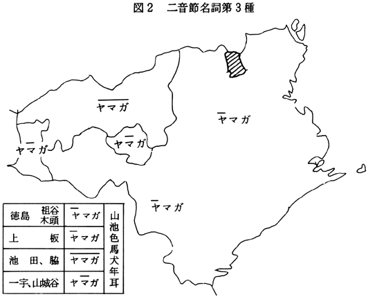 b 二音節名詞第3類、これには第5類まで五つの種類があるが、特徴を示すのは第3類であり、これも徳島と同じグループに入るものである。(第2図)